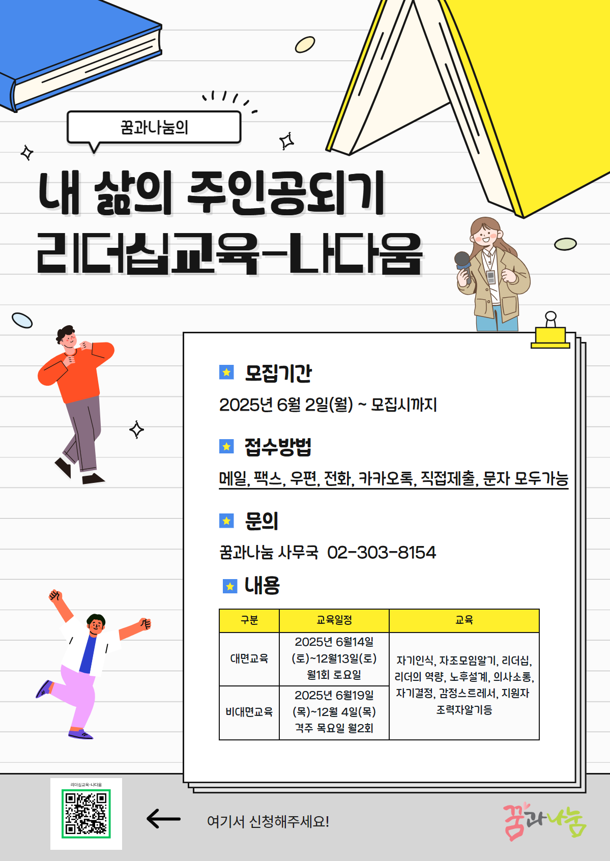*신청방법 및 대상 ① 신청대상 – 자신의 삶의 주인공, 리더가 되고 싶은 발달장애인 누구나 ② 신청기간 – 2025년 6월 2일(월)~ 모집시까지 (선착순모집) ③ 신청방법 – 메일, 팩스, 우편, 전화, 카카오톡, 직접제출, 문자 모두 가능 1) 첨부된 신청서 제출 2) 토요일과 일요일은 직접제출이 어려움 3) 자료다운 받는 곳 ①사단법인 꿈과나눔 홈페이지 www.dreamnshare.org (공지사항) ②개별메일 및 카톡으로 전송가능(개별로 요청) 4) 전화신청 : 사무국에 전화를 걸어서 신청가능함 5) 카카오톡: 카카오톡에 사단법인꿈과나눔 검색 후 채팅으로 신청 6) 문자전송 : 010-7235-8154로 문자 메시지로 신청 7) 구글신청 : https://forms.gle/v4TBG2AUw5zA9nDr6 ④ 선정기준 – 선착순모집 : 리더십교육에 관심있는 발달장애인 20명 (대면교육-1반(9시~11시):8명, 2반(11시~13시): 8명 비대면교육:4명) ⑤ 진행방법 – 1) 개별인터뷰를 통해 참여자에 대한 개별교육계획 수립 2) 대면교육과 비대면교육(줌으로 진행)으로 나누어서 진행 3) 대면교육은 2반으로 진행되며, 한반에 8명씩 진행, 1반은 9시~11시, 2반은 11시~13시에 진행됨명으로 월1회 토요일 진행됨 5) 비대면교육은 목요일에 줌으로 진행되며, 4명으로 1반이 진행됨. ⓺참여비용 : 총 20,000원(이만원) - 총20회기 참여 전체 비용 간식비 및 진행비로 쓰일 예정입니다!