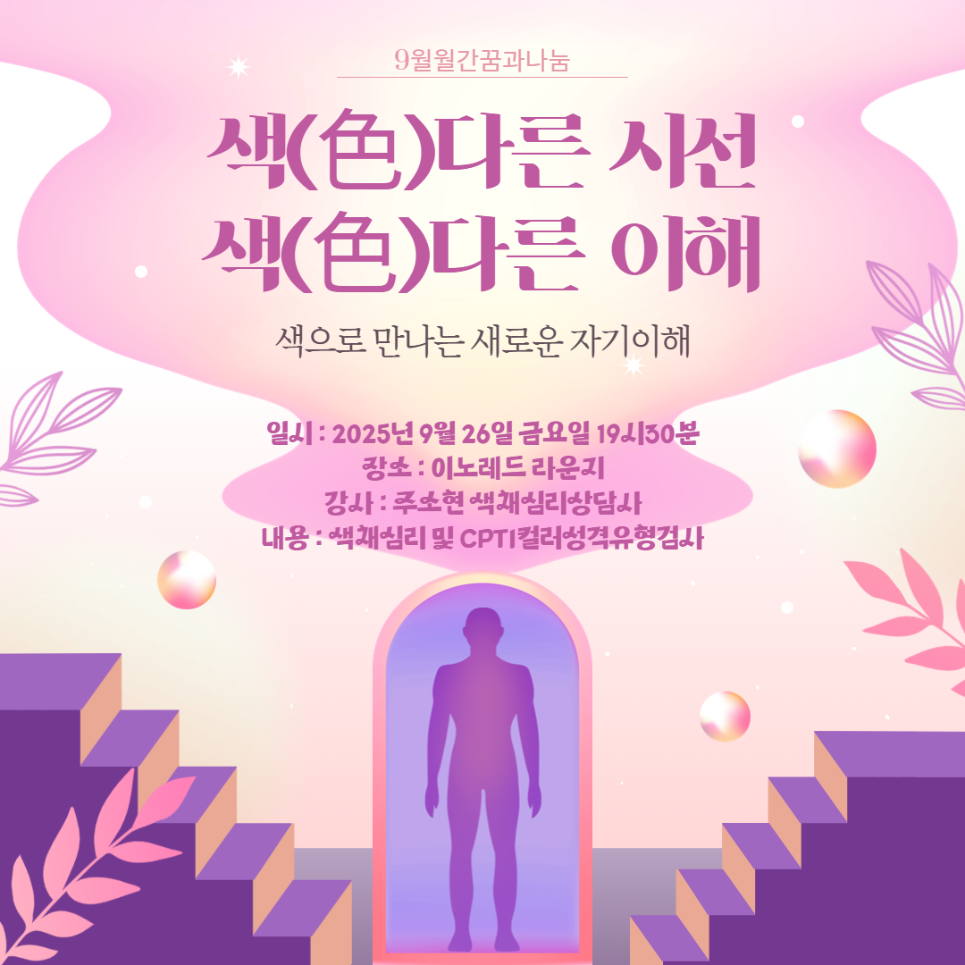 “색(色)다른 시선 색(色)다른 이해” 우리의 모든 삶의 기본은 자기이해부터 시작합니다. 우리삶에 있는 많은 자기이해를 넘어서 이번에는 꿈과나눔에서 우리가 많이 접하는 색으로 나를 이해해보는 색으로 만나는 자기이해를 준비했습니다. 우리 꿈과나눔은 여러분들이 여러분의 자리에서 아름답게, 자신을 위해 성장하기를 원합니다. ♥일시 : 2025년 9월 26일(금) 19:30~21:30 ♥대상 : 섹채심리에 관심있는 사회복지종사자 15명 ♥강사 : 주소현 색채심리상담사 ♥내용 : 색채심리 및 CPTI 컬러셩격유형검사