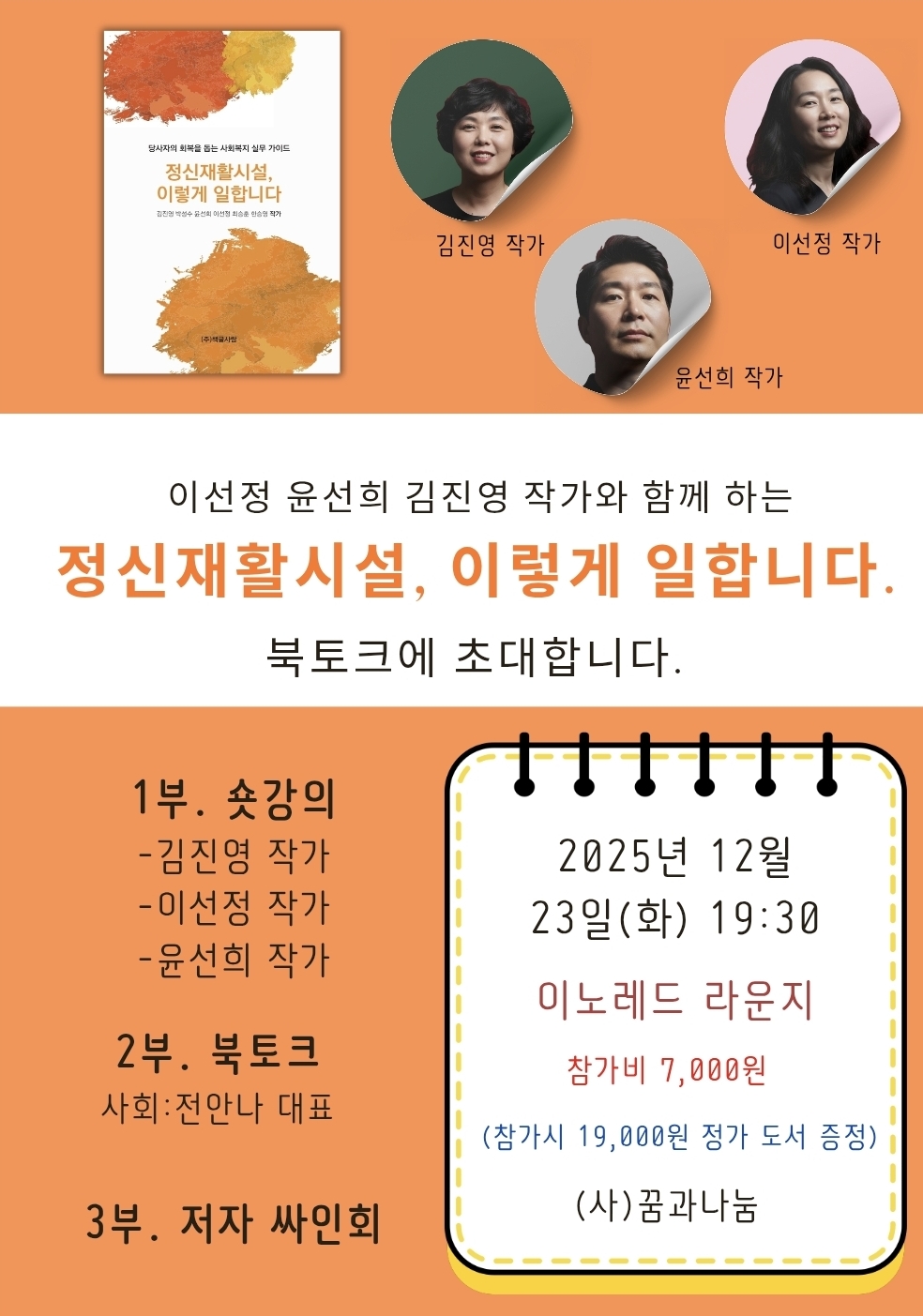 2025년의 마지막 활동을 의미있는 북토크로 마무리하게 되었네요, 정신재활시설에서 일하시는 사회복지종사자분들의 이야기를 담은 “정신재활시설, 이렇게 일합니다”의 작가님들과 함께 현장의 이야기를 함께 하려고 합니다. 작가님들의 강의와 북토크가 있는 북토크 많이 참석해주세요! 참여하신 분들에게는 책을 드려요~ 우리 꿈과나눔은 여러분들이 여러분의 자리에서 아름답게, 자신을 위해 성장하기를 원합니다. ♥일시 : 2025년 12월 23일(화) 19:30~21:30 ♥대상 : 사회복지종사자 15명 ♥강사 : <정신재활시설, 이렇게 일합니다> 저자 ♥참가비 : 9,000원(기업은행 217-091728-04-017 사단법인꿈과나눔)