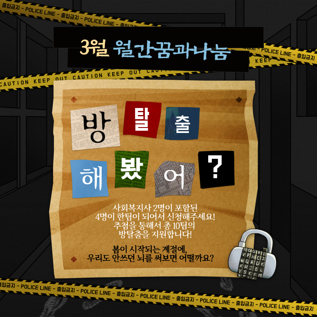 겨울내 숨죽여 있던 새싹이 움터 올라오는 봄을 맞아, 우리도 안쓰던 뇌를 깨워보는 시간을 갖고 싶었습니다. 여러분, 방탈출 해보셨어요! 방탈출로 우리가 안쓰던 뇌를 깨워봅시다! 우리 꿈과나눔은 여러분들이 여러분의 자리에서 아름답게, 자신을 위해 성장하기를 원합니다. ♥모집일시 : 2026년 3월 17일(화) ~ 3월20일(금) ♥추첨일시 : 2026년 3월23일(월) ♥대상 : 방탈출로 안쓰던 뇌를 깨우고 싶은 사회복지종사자가 속한 10팀 ♥방법 1. 사회복지종사자가 2명이 포함된 2명~4명으로 구성된 팀을 만들고, 신청해주세요! 2. 추첨후 선정된 팀은 하고 싶은 방탈출을 선정해서 알려주시면, 방탈출 비용을 입금 또는 결제해드려요! 3. 선정된 팀은 방탈출 후 사진과 후기를 남겨주세요!
